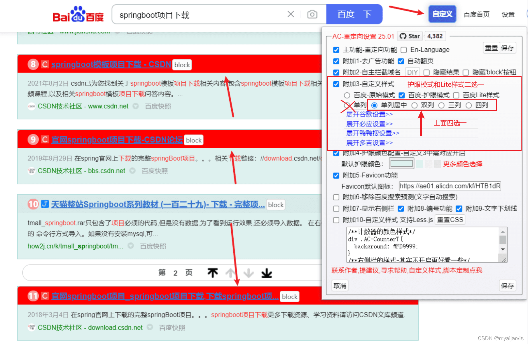 需要配合油猴插件《AC-baidu-重定向优化百度搜狗谷歌必应搜索favicon双列》使用,记得先安装,该脚本设置看下方