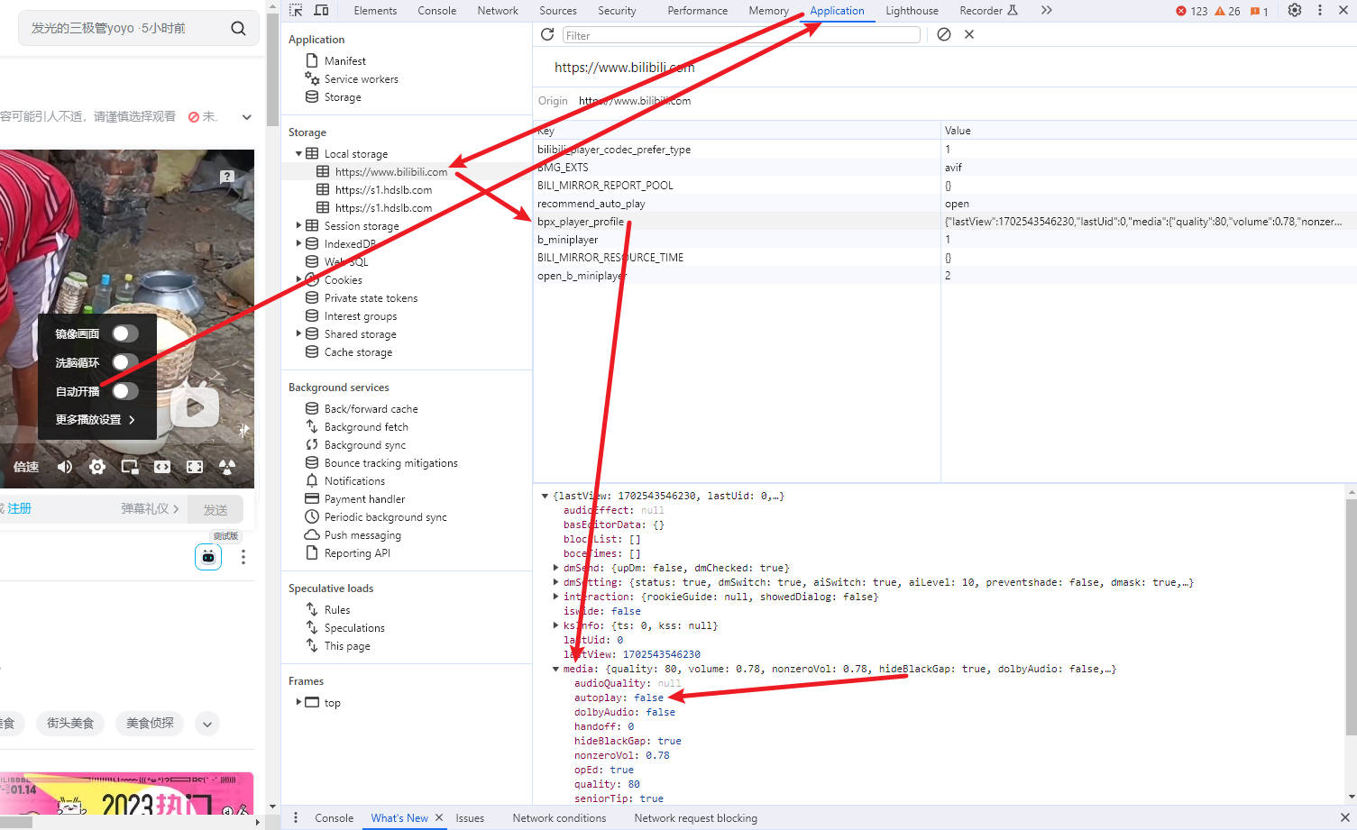 自动开播这种设置,可以发现它会在所有的视频页面中都通用,可以推断出用户的设置被记录下来了,要么是播放设置会上传到B站服务器,然后每次打开视频时获取并应用,要么是存在了本地。显然这种不重要的数据存储在本地更加合理,还能减少服务器的负担。那么根据经验就可以去Local Storage中去找了。