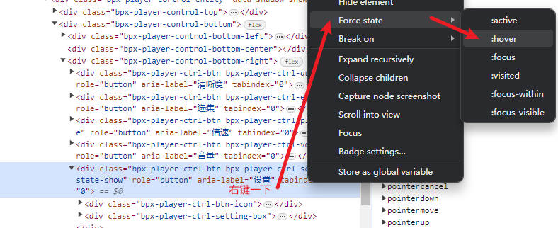 如果是用hover来实现显示/隐藏效果的,可以让元素处于强制hover的状态:右键一下元素 > Force state > :hover