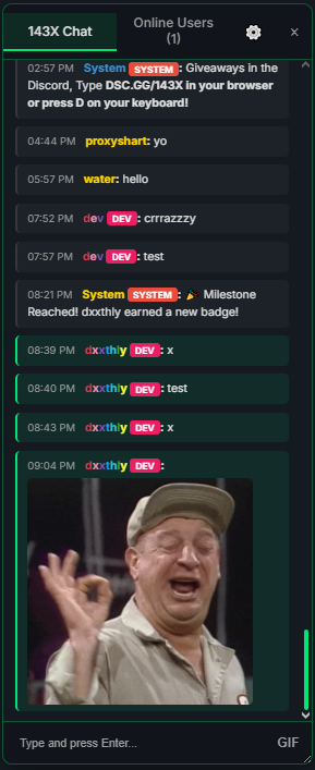 Adds the 143X community chat with profiles, a working GIF search, admin tools, profanity filter, and Discord integration to Slither.io.
