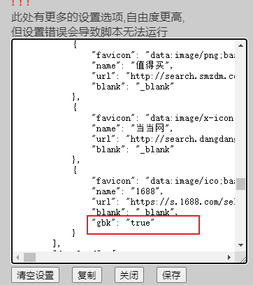 2.复杂的:“设置 - 更多设置 - 配置文件” 找到你自己添加的1688,然后在下面添加"gbk":"true"