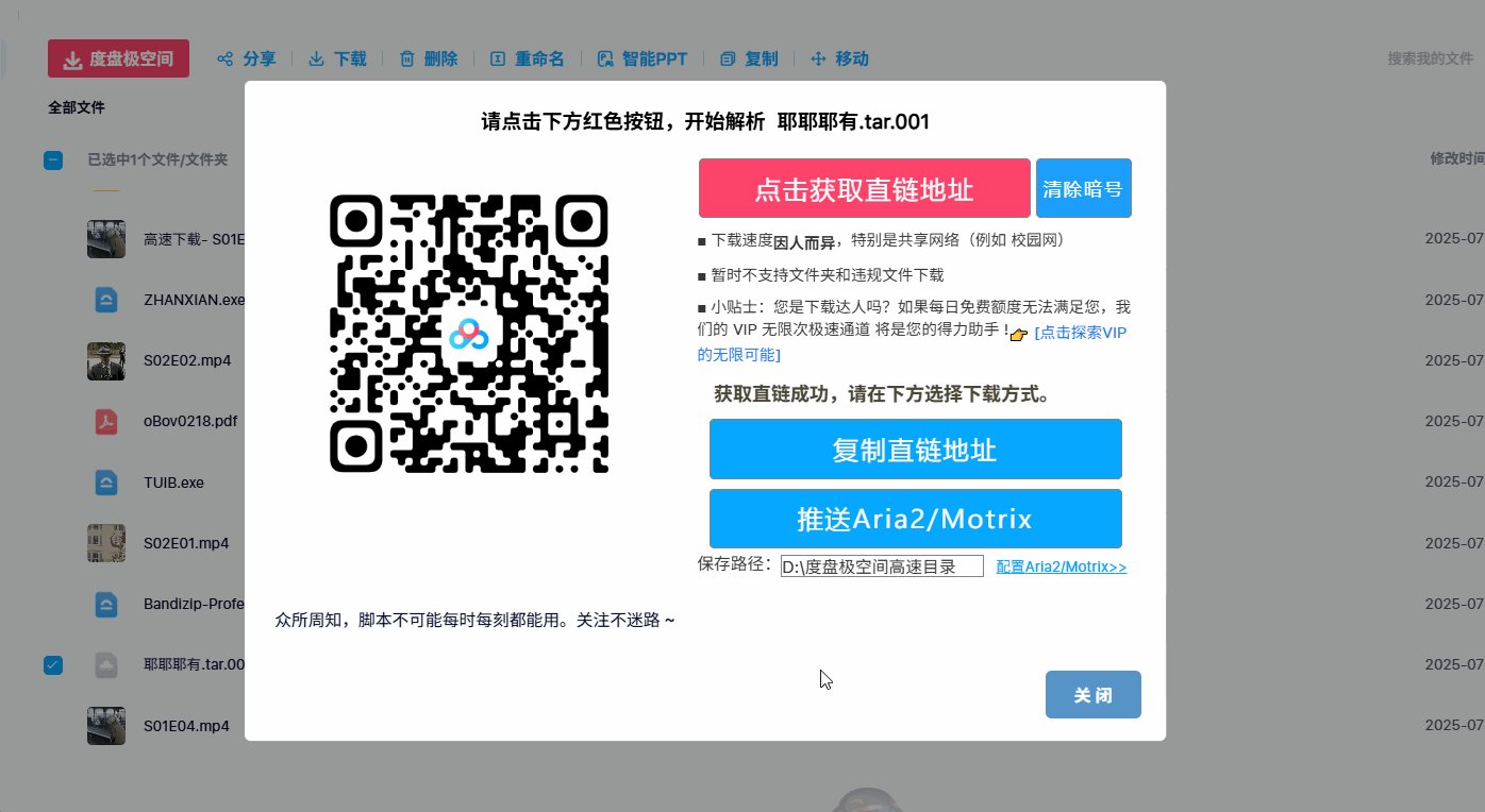5. 脚本所涉及的接口均为官方开放接口,需使用正版SVIP账号进行代理提取高速链接。仅供学习参考,无破坏官方接口行为,有条件建议充值官方SVIP使用。