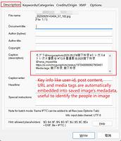 • Adds two 💾 save buttons on each image (bottom-left and bottom-right corners, optimal for both hands) for saving images with embedded XMP metadata. dc:description in image file contains: